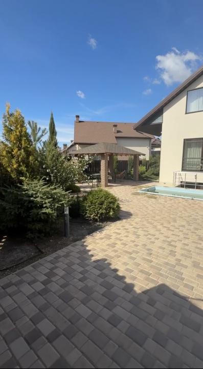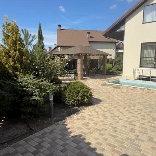 На участке расположен дом 3 этажа, один из них цокольный, бассейн, беседка, зона парковки на 2 авто. Произведено озеленение.